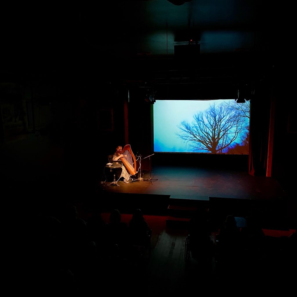 Deep in the BC forests of the Cariboo Mountains you will find the wee but mighty town of Wells and…the Sunset Theatre. In its 88 year old history, the Sunset has been a movie theatre, gambling house, town hall, and even a temporary morgue after a tragic mine explosion in the 1940s. On Sunday evening, August 10th, it will be the stage for Trees.Listen, a tree filled music performance of Celtic harp with fixed electronics written by Frank Horvat and Sharlene Wallace and performed by Sharlene. There will also be photos/videos by Sharlene projected throughout the performance of this 9 tree composition suite.